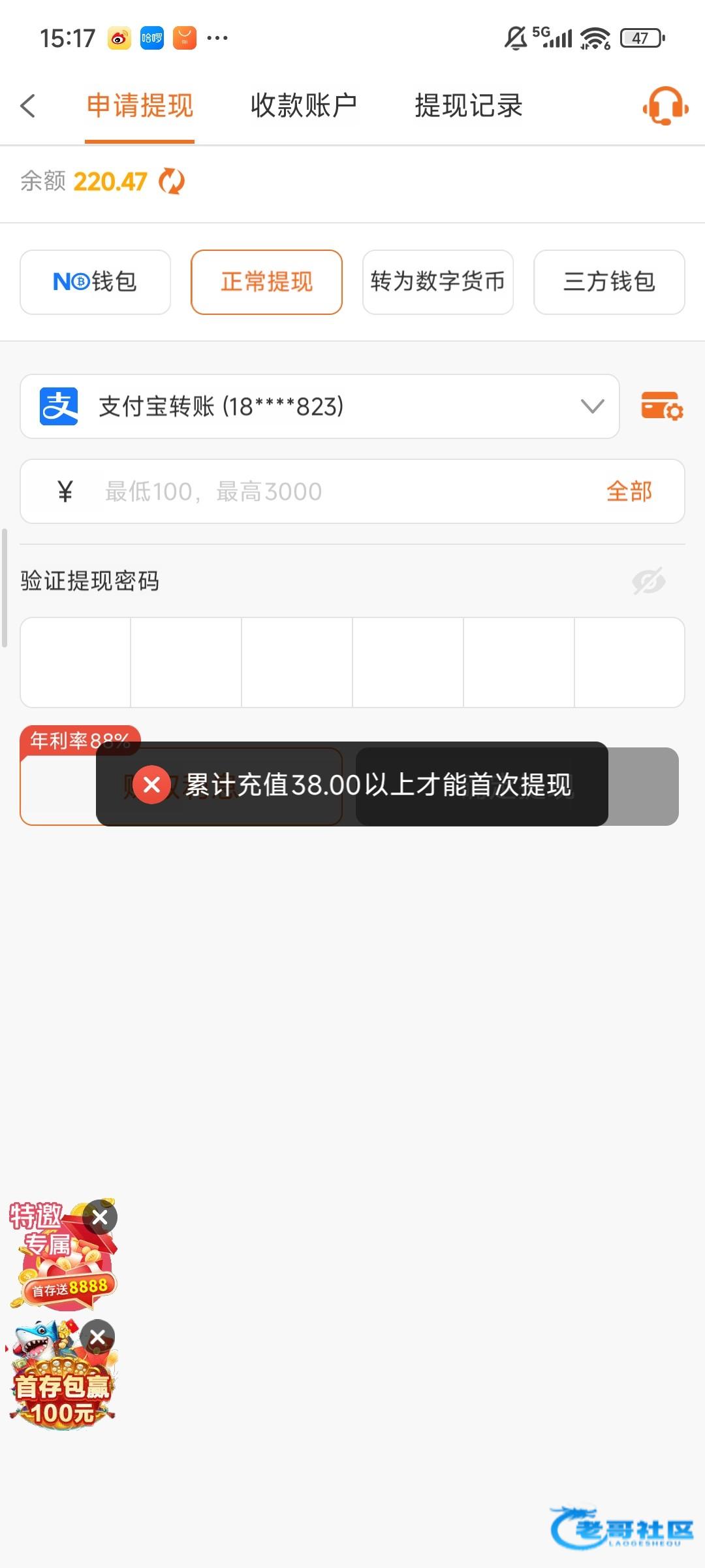爆了两百充了四十提现一分钟到账