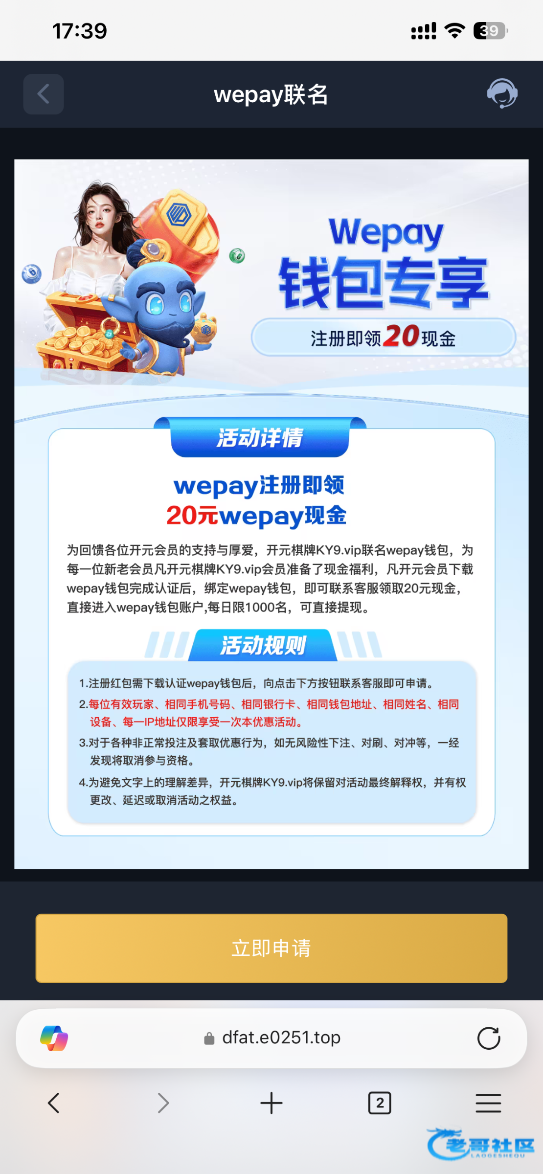 wepay钱包新用户注册领取20,然后进入ky047.cc充值即可,wepay地址wepay.info