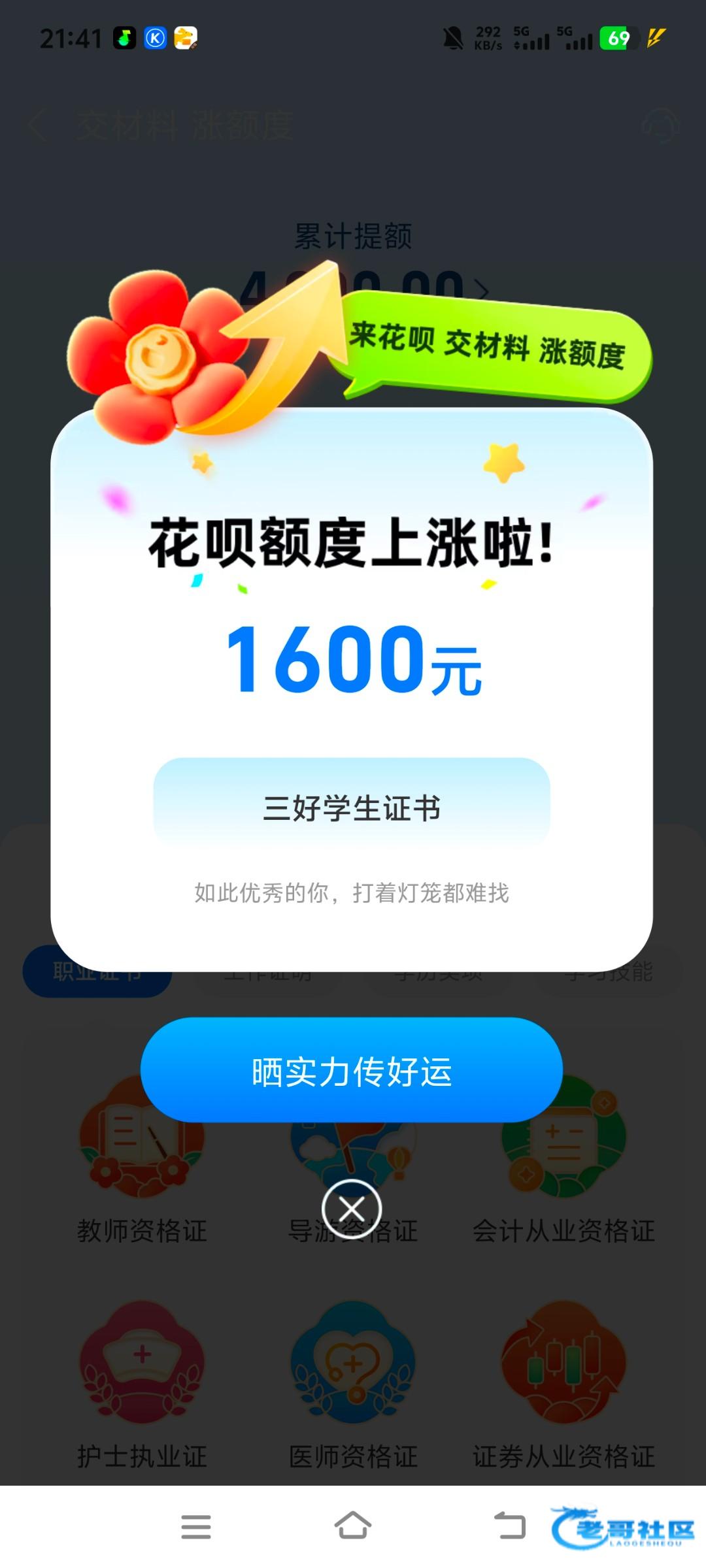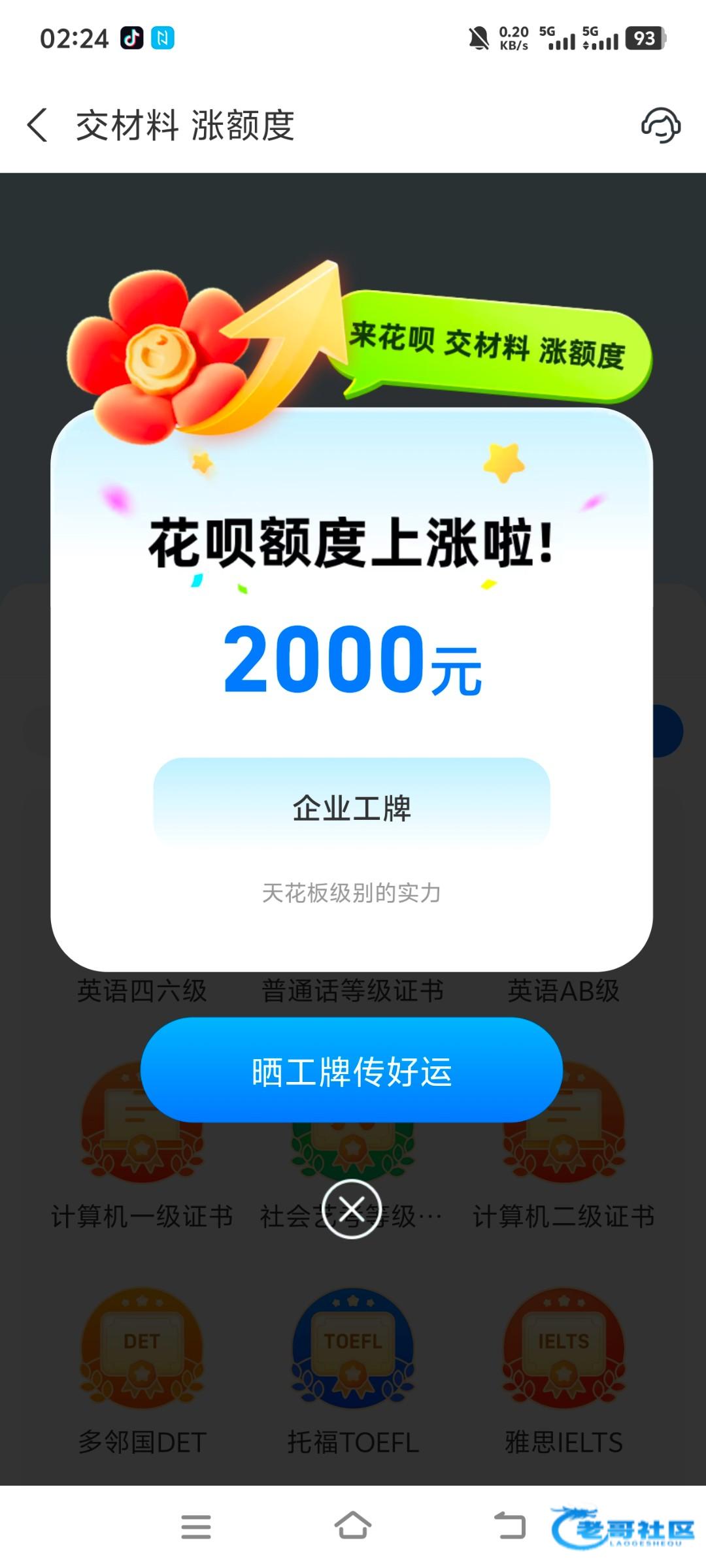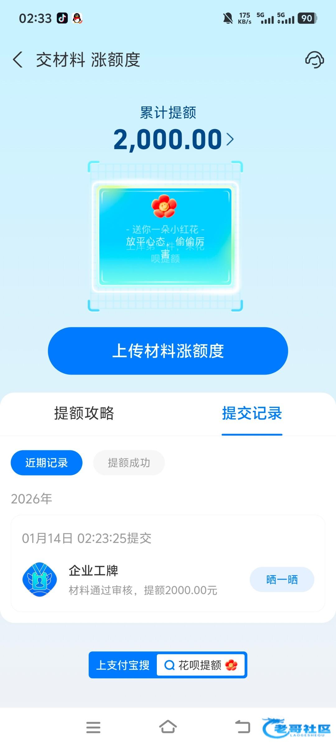 2026年1月14日凌晨2点,身上身无分文的我连买瓶水的钱都没有,到处找白嫖下载各大贷款软件,点到花呗突然看到有提额入口,有各种证明可以提交,最主要的是要有工作证明,我是用了3年前进厂发的厂牌,第二天我就跑路了一直留着这个厂牌没想到今天派上用途,上传后1分钟就给我发了2000额度,我支付宝一直都是50/100额度很多年了,一直提升不了,没想到今天终于升了,饿死了我要去买吃喝的然后上分打狗了,没钱的老哥去试试。