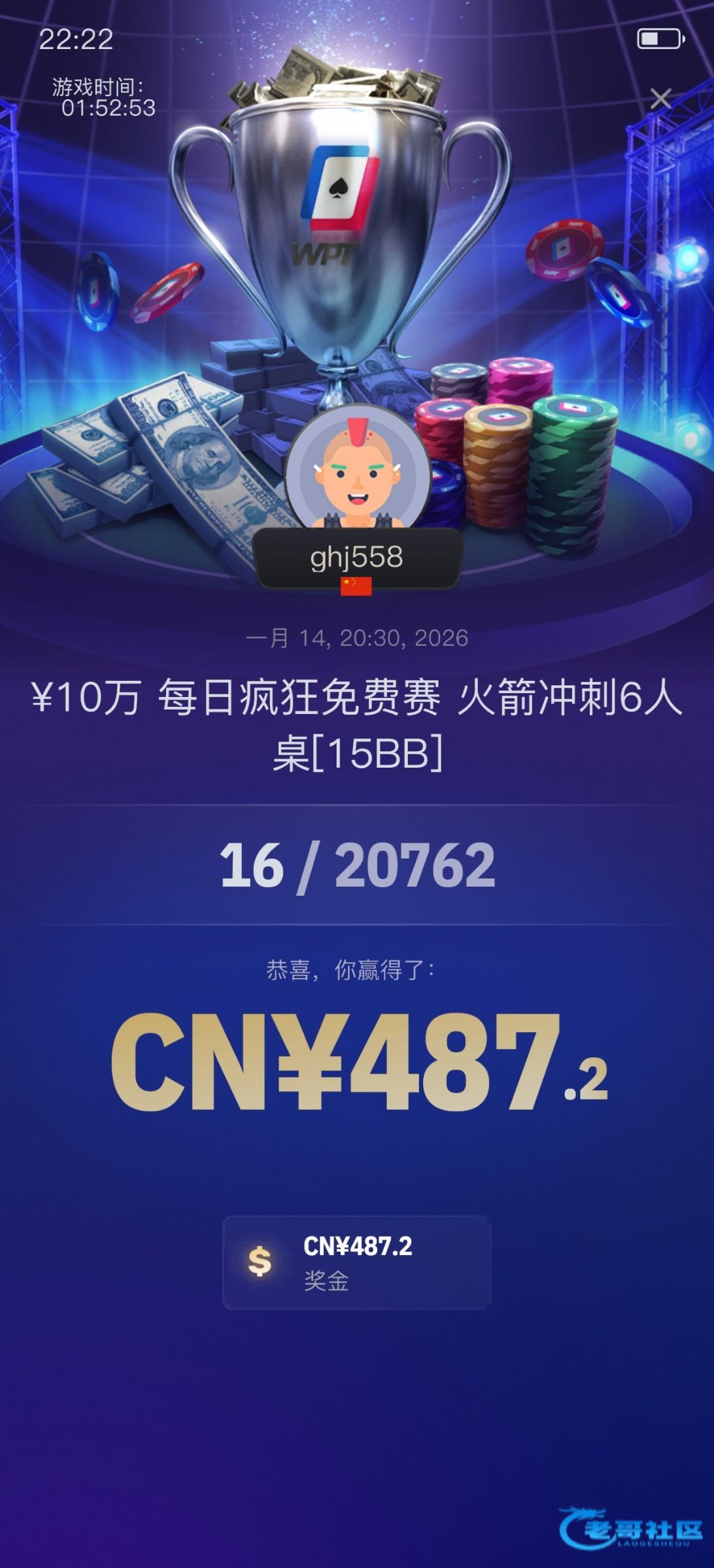今天打进16名,被人保底最后一张牌秒了,不然有希望争一下第一,还是差点运气唉!